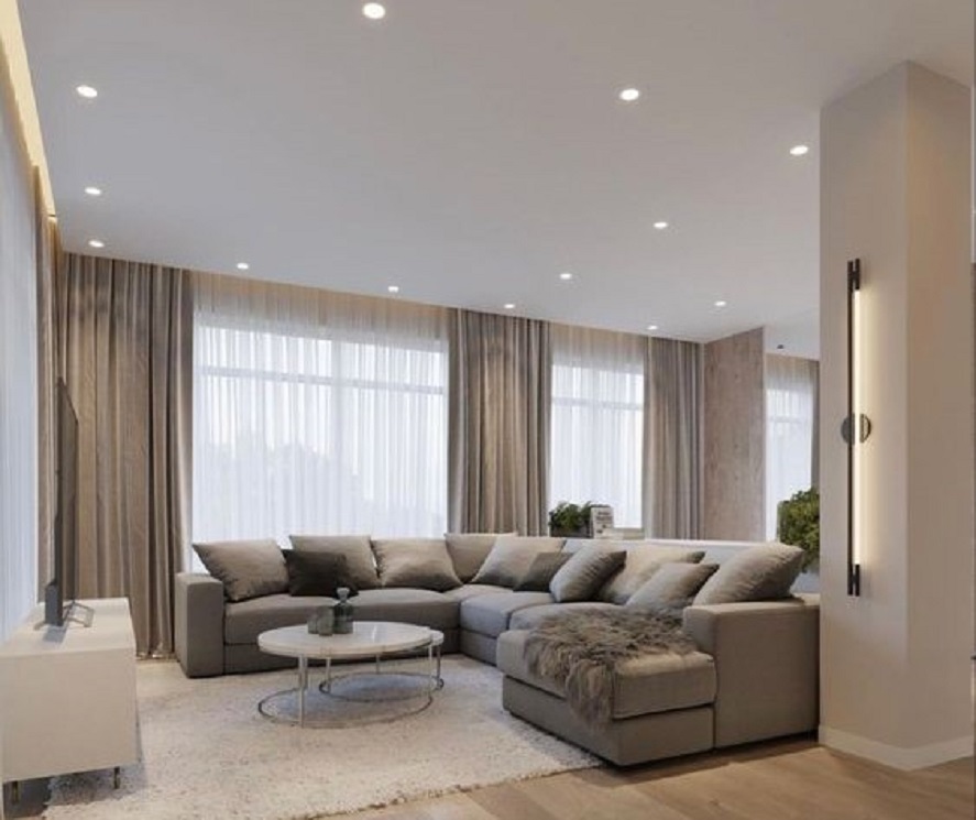 Что касается цвета, то потолок в гостиной, как правило, кремовый или белый, матовый или глянцевый.