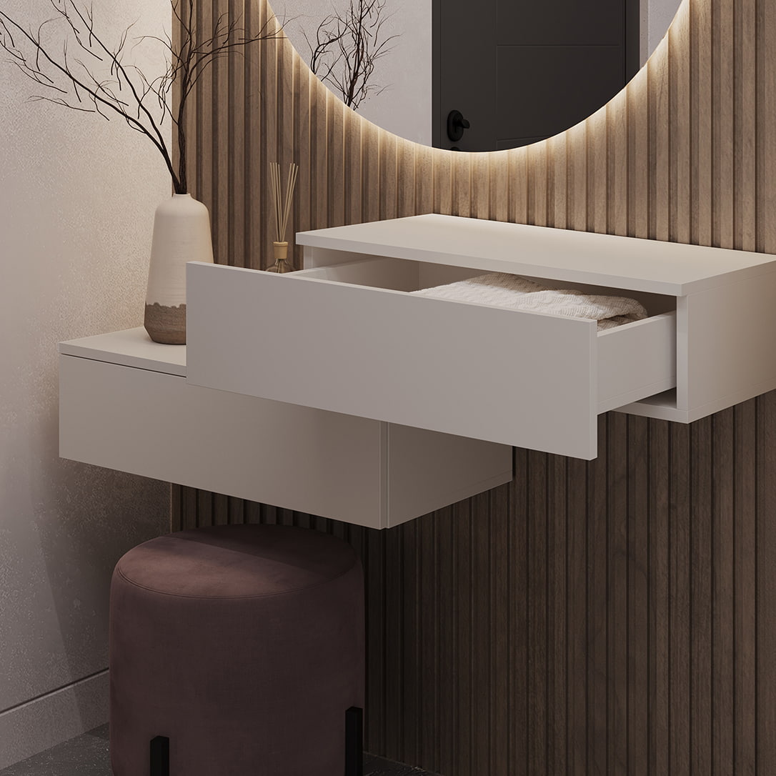 - Повышенную нагрузку. Перед тем как заказать комод, обязательно убедитесь, что его ящики и полки способны выдерживать необходимый вес. Ведь даже лишние полкилограмма могут стать причиной сокращения срока службы направляющих. То же касается и шкафов — не стоит вешать одежду и тяжелые пледы на открытые фасады.